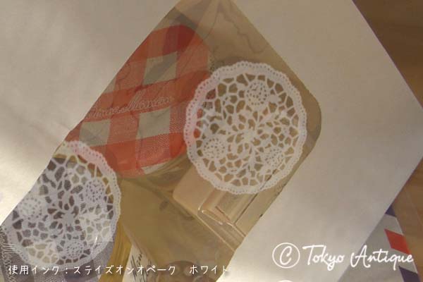 カットが美しい薔薇のレースペーパードイリーをスタンプにしました。 白インクはもちろん、茶色のインクでレトロっぽく。 女性らしいワンポイントにどうぞ。