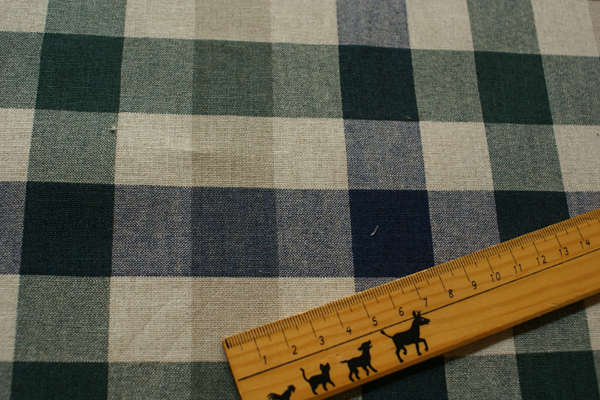 約26mm×30mmのブロックチェックです。 厚みは中厚程度の厚みがあり、インテリア等の布雑貨、ウェアーにもかわいいです。 こちらの生地でバブーシュを作ってみました。(画像あり)