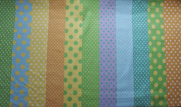 11種類のドットが組み合わさった、とてもかわいいストライプパッチです。 ドットの大きさも4mm〜2.5cmとバリエーション豊か。 一枚で何通りも楽しめて、お得感もワクワク感もバッチリです! ひと柄は約9.5cm前後で、ほぼ同じ幅のストライプです。 ギャザーを寄せて簡単パッチスカートも素敵ですね♪ 芯地を貼ってバッグにしたり、裏布にも良いですね(*^^*) 使い方次第でいろいろ楽しめますよ♪