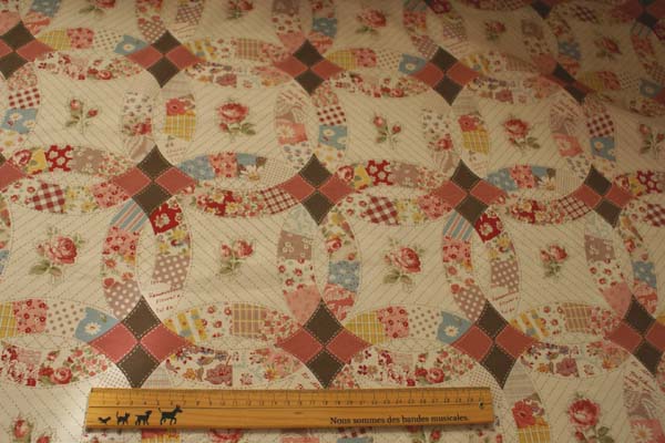 数多くあるパターンの中でも人気のダブルウェディングリングのプリントです。 一枚一枚つなぎ合わせるのは大変ですが、 こんなプリントがあれば、キルト綿を挟んで なんちゃってキルトもすぐ作れちゃいますね! キルトにしなくても、そのままクッションカバーや テーブルクロス等、インテリアにも素敵です(*^^*) リングの大きさは、直径約23pです。