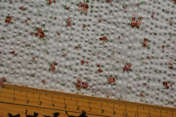 サテンドビーストライプ生地にリップル加工を施した 春夏のお洋服に是非使って頂きたい涼しげな生地です。 ちりばめられたプチローズが可愛いです♪