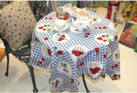 ギンガムチェックベースの生地に大き目のイチゴが かごやボールに入っています。 ちょっとくずれた感じのイチゴのイラストがなんともいえずキュート♪ テーブルクロスやベッドカバー等、大き目に使ってもかわいいですよ♪