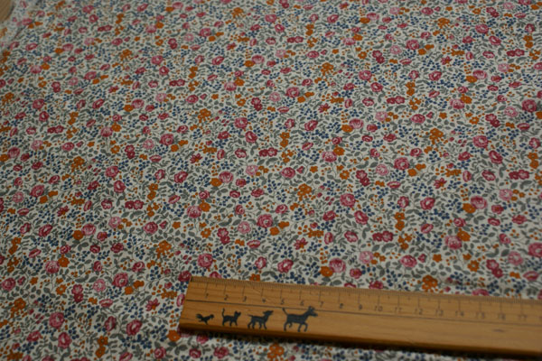 リバティを思わせるような、ローズプリントです。 生地質も上質なクリスタルローンで、上品な嫌みのない光沢があり 素敵なワンピースやブラウスが出来ますよ(*^^*)
