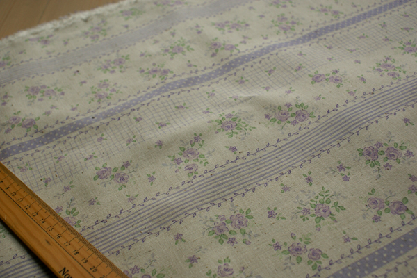 薔薇にドット、ストライプ、チェックが生地幅に対して平行にプリントされており、 筒状に縫ってゴムを入れればパッチ風スカートも簡単に作れちゃいます。