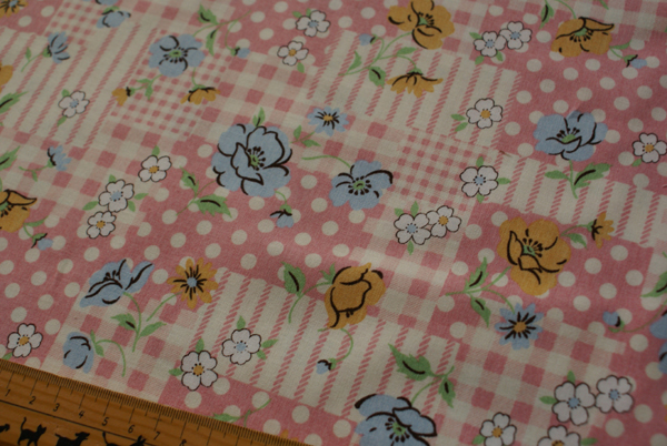 ビンテージ風などこか懐かしい雰囲気をかもし出すプリントで 色合いも落ち着いたかわいさがあります。 ドット、ストライプ、チェック柄のパッチワークに ビンテージフラワーが風に乗って飛んでいるような感じです。 生地はシーチングで縫いやすい生地なので、いろいろ活躍してくれそうですよ♪