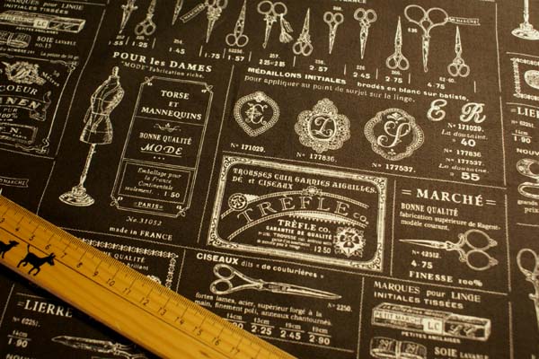 小関鈴子さんデザインのソーインググッズが満載の アンティーク風なプリントです。 扱いやすい厚みで、パッチワークや布雑貨等いろいろ活用してくださいね♪
