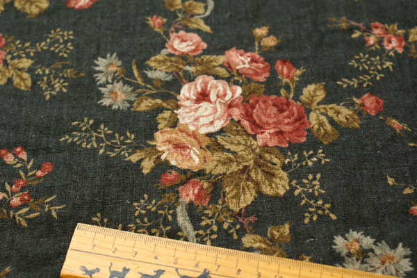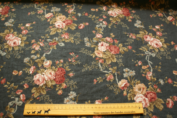 濃い目の紺色の地色に薔薇のブーケがプリントされた素敵な生地です。 エアータンブラー加工されており、柔らかな風合いで チクチク感もほとんどない上質のリネンです。 厚みは中厚程度の厚さです。 ウェアーや布雑貨やインテリア等いろいろ活用してくださいね。