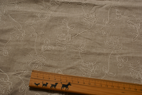綿麻の生地にローズ柄の刺繍が施されたハーフリネンです。 プリントとはまた違った雰囲気で素敵ですよ♪ ワンピースを作ってみましたが、刺繍のローズが主張し過ぎず 良い感じのワンピースになりました(画像あり)。 生地幅もたっぷりありますので、デザインによっては 着丈+袖丈+縫い代でウェアーも作れます。 画像のワンピは袖を無地のリネンで作ったので、 着丈+縫い代で出来ました(*^^*) ウェアーやインテリア、バッグ等の布小物にどうぞ♪