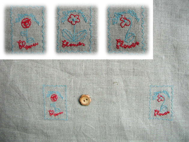 生成り(リネン色)のリネンに、ブルー&レッドの3種類のフラワースタンプが刺繍されています。 フラワースタンプは横に10p間隔に刺繍されています。 縦は5p間隔に上下交互に刺繍されています。