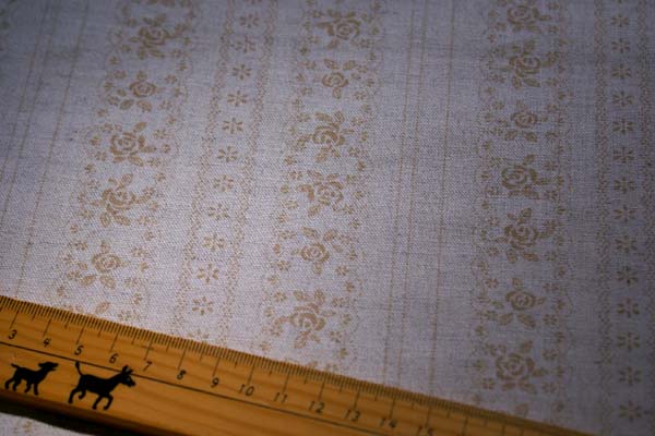 レース柄がボーダー状にプリントされたやや薄手のキャンパス地です。 可愛さの中に上品さもあり、使いやすい生地です。