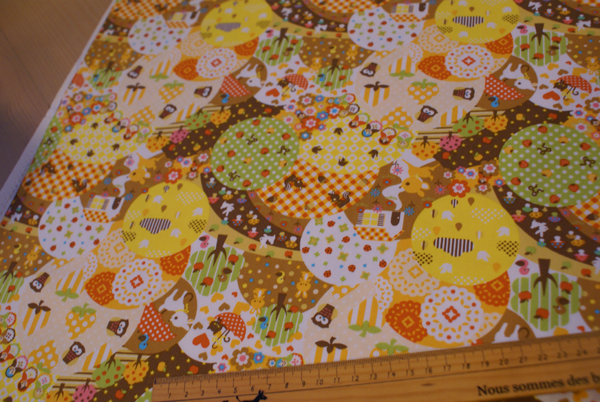 マトちゃん、うさぎ、バンビにいちごやきのこ。。。。 かわいいツボがいっぱいです(笑)。 サークルパッチがまた良い感じで、しつこくなりそうな柄が 上手く調和されて、見ているだけで楽しいプリントです。 バッグやインテリアにいかがですか〜。 生地はオックス地です。