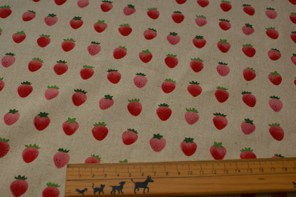 薄めのリネンカラーの地色に、美味しそうなかわいい苺達が並んでいます。 厚みはオックス地程度の厚さです。 バッグや布小物、インテリヤ等、活躍してくれそうです♪v(*'-^*)ゞ^;*・'゜☆ブイ☆