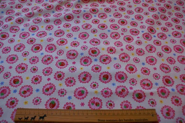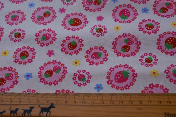 キュートなお花のリースの中に苺がプリントされたラブリーな生地です(*^^*) 生地はブロードで縫いやすく、入園入学グッズも楽しくつくれそうですね♪