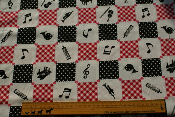 ブロック状に赤のバイアスチェックと黒地に白のドットと ミュージック柄のシルエットがプリントされたブロード地です。 入園入学にもピッタリです。