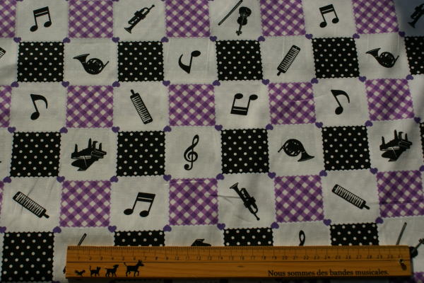 ブロック状に紫のバイアスチェックと黒地に白のドットと ミュージック柄のシルエットがプリントされたブロード地です。 入園入学にもピッタリです。