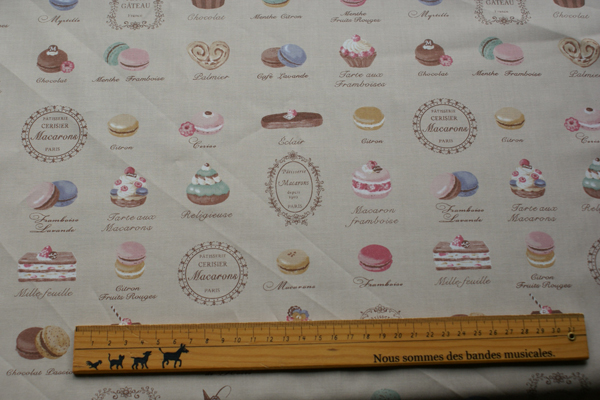 カラフルでおいしそうなスウィーツがいっぱいのキュートな生地です。 スィーツ柄の発色もきれいで、気品さも感じられます。 バッグやポーチの布雑貨にかわいいですね(*^^*) カーテンにしても素敵♪