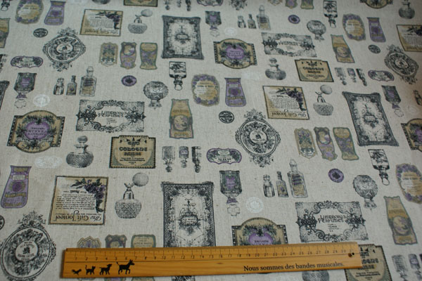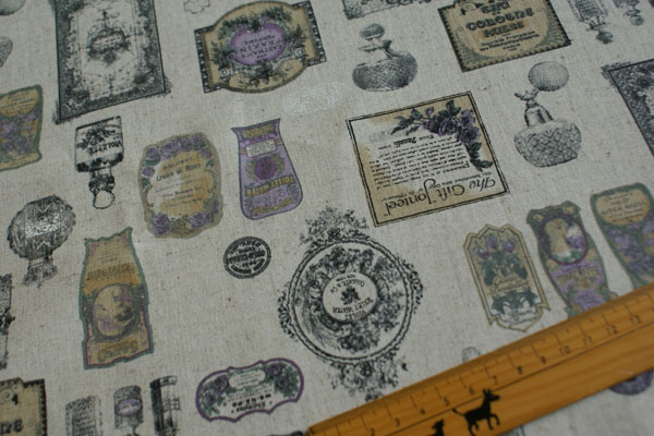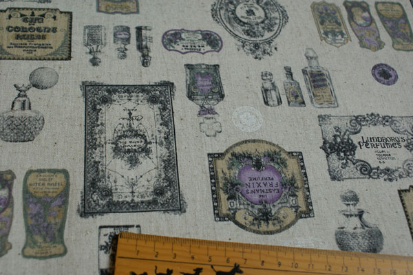 色々な香水がプリントされた、パリ風なおしゃれな生地です。 厚みは中厚程度で、バッグやポーチ等の布雑貨や インテリアにも向いています。