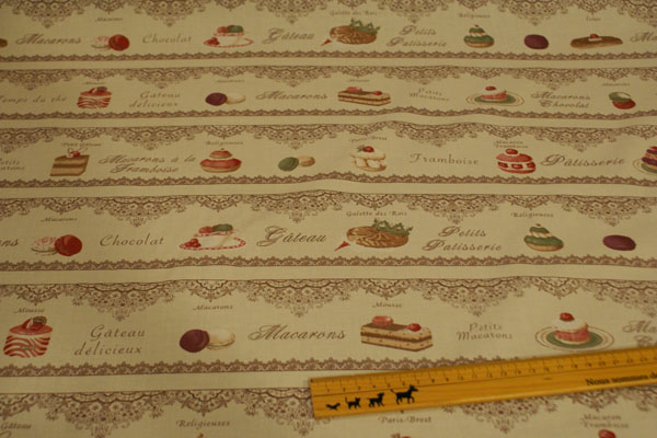 カラフルでおいしそうなスウィーツがいっぱいのキュートな生地です。 レース部分は抜染プリントをしているので、柄がはっきりでて、 スィーツ柄の発色もきれいで、気品さも感じられます。 バッグやポーチの布雑貨にかわいいですね(*^^*) カーテンにしても素敵♪ 新色追加しました。