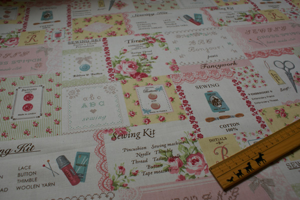 アンティーク感溢れるロマンティックな雰囲気のソーイング柄です。 クロスステッチや小花等、かわいいモチーフが集まって パッチワークの様な柄になっているので、 そのまま1枚でも存在感があります。 切り取る場所を変えると、違った雰囲気の作品が色々作れますね(*^^*)