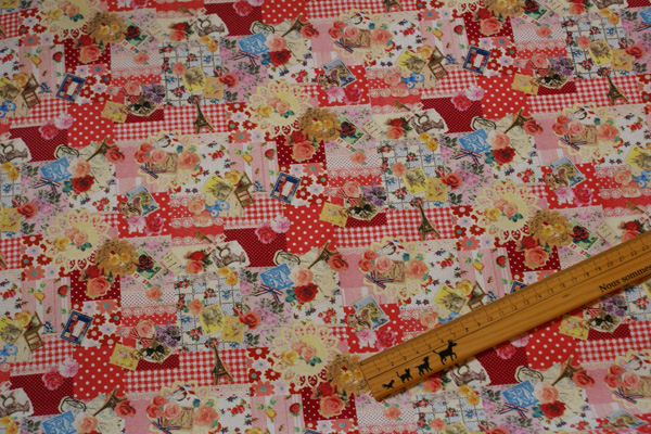 ちっちゃくてかわいい雑貨や切手がコラージュパッチされた おしゃれでキュートな生地です。 モチーフ使いにもかわいいですね♪ 眺めているだけでも幸せな気分になれますよ〜
