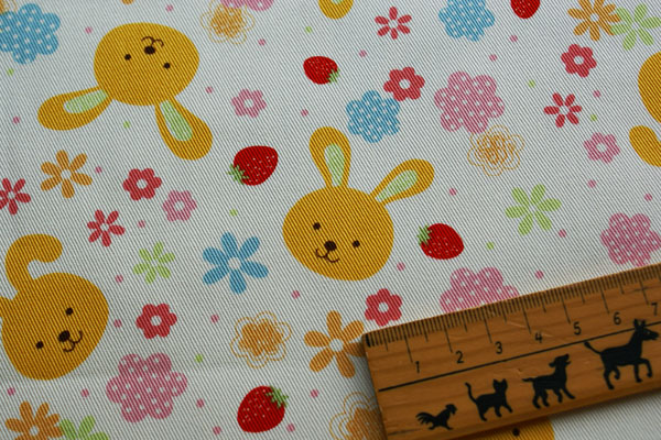 ラブリーなうさぎさんにお花とフルーツがプリントされたオックス生地が仲間入り♪ 厚すぎず、薄すぎず程よい厚みのオックス生地ですので バッグや巾着等の袋物にピッタリ! 入園入学準備にもお勧めです(*^^*)