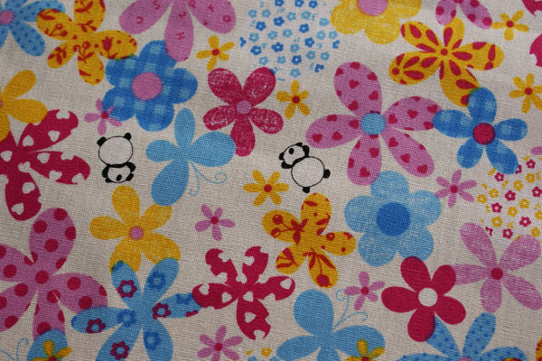 お花畑の中でたわむれるパンダちゃんがとってもキュートな生地が仲間入り〜♪ 厚みはツイル地ほどの厚みで、入園入学グッズにもピッタリです。 お子さんのバッグ等の袋物、エプロンやスモックにピッタリ♪ 子供部屋のカバーリングにも良いですね。