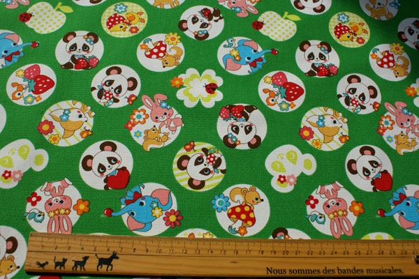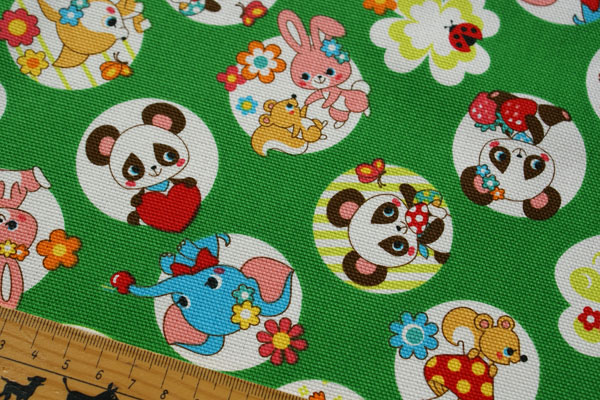 約4.5cmのまるでシャボン玉のような丸の中にキュートなパンダや 動物たちがプリントされたかわいい生地です。 眺めているだけでhappyな気持ちになれますね♪ 生地は厚手のしっかりした10番オックスなので バッグやポーチ等の布雑貨にピッタリです。 お子さんの入園入学グッズにもかわいいですね!