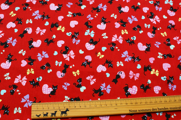 ハート、リボンの一部がグリッター加工されたかわいいネコちゃん柄のプリント生地です。 いたずらネコちゃんがなんとも愛らしいですね♪ バッグやポーチ等の布小物や入園入学グッズにもどうぞ!
