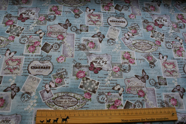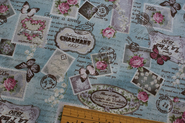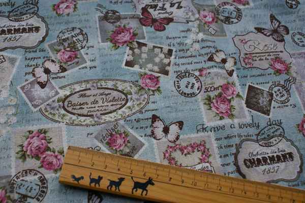 筆記体ロゴベースに蝶や切手がコラージュされたおしゃれな生地です。 アンティークな雰囲気がとても素敵ですね♪ しっかりしたキャンパス地ですので、バッグやポーチ等の布小物や クッションカバー等のインテリア、エプロンにも素敵。 バッグの裏地にしても素敵ですね。