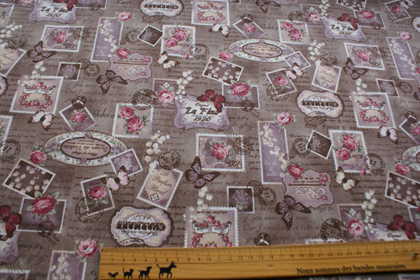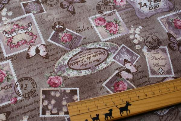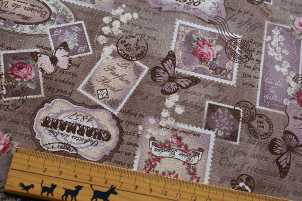 筆記体ロゴベースに蝶や切手がコラージュされたおしゃれな生地です。 アンティークな雰囲気がとても素敵ですね♪ しっかりしたキャンパス地ですので、バッグやポーチ等の布小物や クッションカバー等のインテリア、エプロンにも素敵。 バッグの裏地にしても素敵ですね。