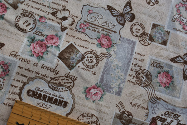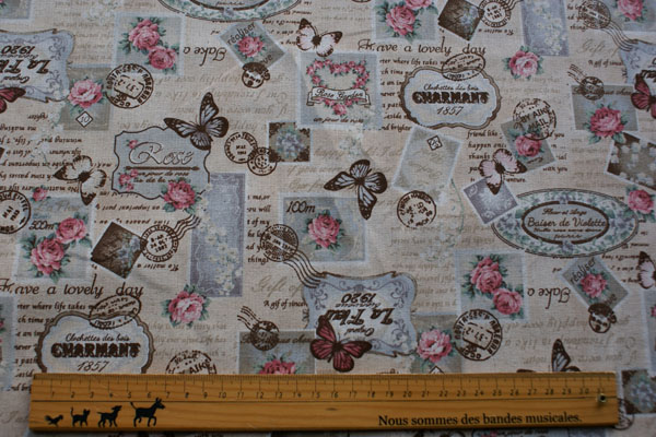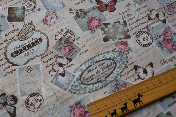 筆記体ロゴベースに蝶や切手がコラージュされたおしゃれな生地です。 アンティークな雰囲気がとても素敵ですね♪ しっかりしたキャンパス地ですので、バッグやポーチ等の布小物や クッションカバー等のインテリア、エプロンにも素敵。 バッグの裏地にしても素敵ですね。
