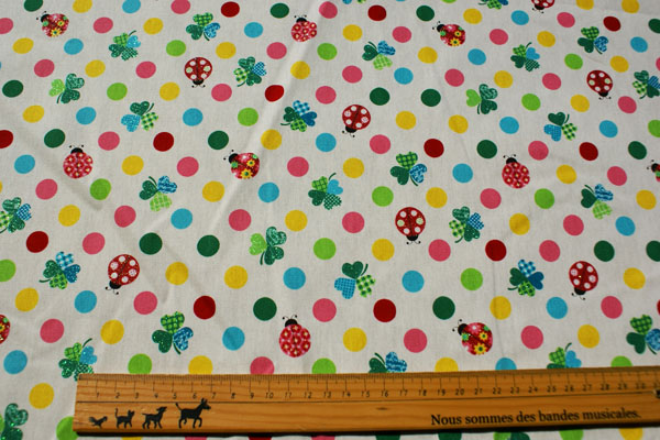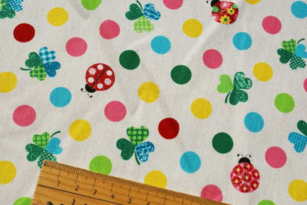 クローバーとてんとう虫にキラキララメが施された、キュートな生地です。 ポップな色使いで、なんだか元気になれますね〜♪ 生地はシーチング。 巾着やポーチ、バッグ等の布小物やクッションカバー等の インテリアにもいいですね!