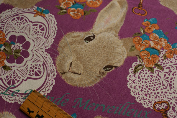 ハートのレースにパンジーがリアルなうさぎさんを引き立てて とてもキュートな生地になりました〜。 大きな柄がまた存在感たっぷりで、とってもかわいいですね♪ うさぎ好きにはたまりません〜(*^^*) ややしっかりめのキャンパス地なので、バッグ等の布小物はもちろん クッションカバー等のインテリアにも素敵ですよ。 大柄を生かした素敵な作品に仕上げてくださいね♪