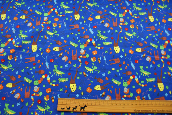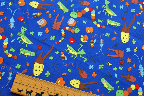 男の子大好き、虫さんがいっぱ〜〜い! ちょっとマンガちっくな虫さんが踊ったり歌ったり、 まるで昆虫パラダイス♪ 眺めているだけで、楽しい気分になっちゃいますね♪ 生地は扱いやすい、シーチング生地です。 お子さんのスモック、体操服入れやコップ入れ等の入園入学グッズにピッタリです。 芯地を貼ってバッグにもかわいいですね。