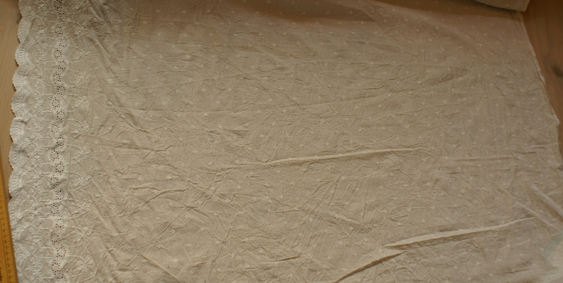 片みみがスカラップ加工された、 薄いベージュ系のリネンカラーの生地です。 ドット風の刺繍もスカラップ部分から約108p部分までされており、 ナチュラルながら上品なスカラップレースです。 ワンピースやチュニック、ぺチパンツにペチスカート等 作りたい物を考えるだけで幸せ気分です〜。