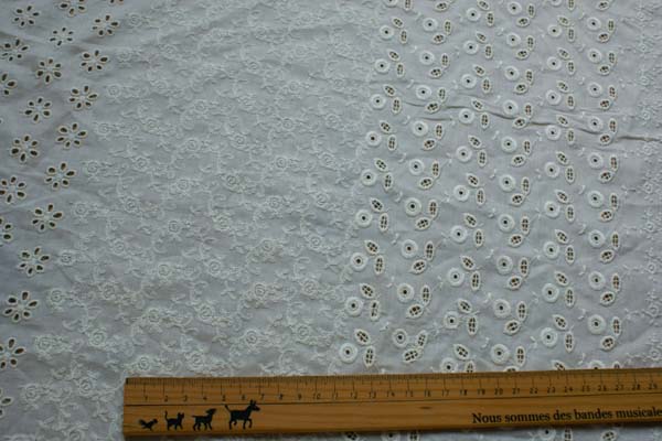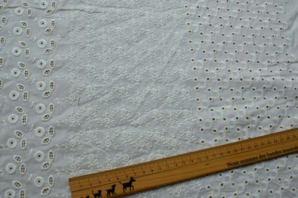 YUWAの素敵な綿レースの登場です〜。 約16〜17p幅で6種類の刺繍が生地幅に対して平行に刺繍されています。 こんなにいっぱいの刺繍で、このお値段はかなりお買い得です(*^^*)