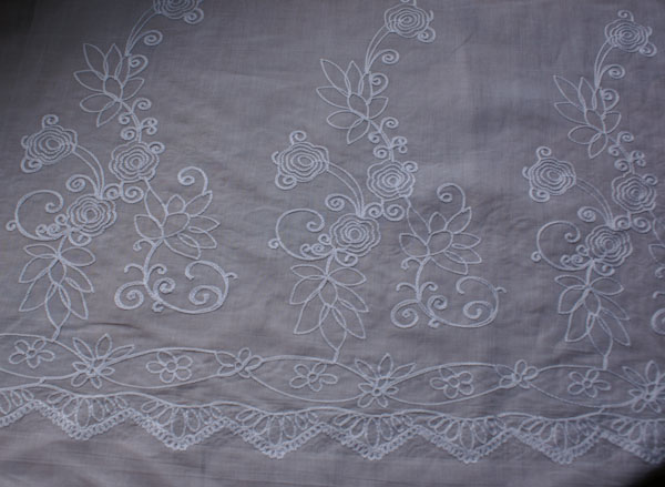 ローン地に片みみがスカラップに刺繍された、素敵な綿ローンレースです。 刺繍部分は約30cmです。 スカラップ部分で切り取って頂いてもいいし、 柄の一部として使って頂いても素敵だと思います。 薄手のローン地なので、透け感があります。 チュニックやブラウス、ペチスカートやペチパンツ等のウェアーはもちろん、 カフェカーテン等のインテリアにも素敵です。