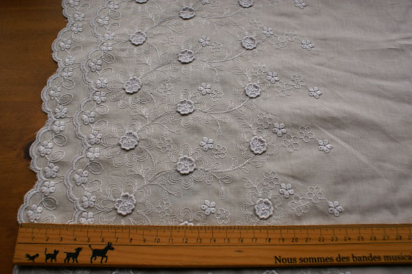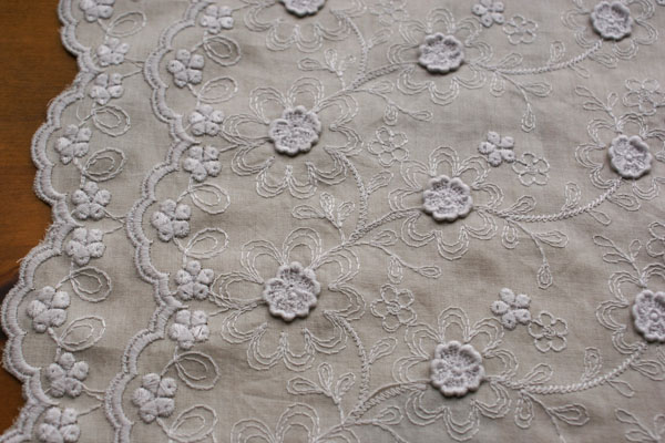 お花の部分にレースモチーフが縫い付けられた、立体的なデザインが 珍しく、上品で素敵なスカラップレースです。 生地は薄手で、上質な綿ローンです。 やや透け感がありますので、重ね着のワンピやチュニック、 ペチパンツ等のお洋服にピッタリです。