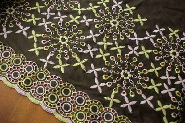 2色使いの大胆な柄のレースが目を引く、珍しく素敵なスカラップレースです。 生地は薄手で、上質な綿ローンです。 やや透け感がありますので、重ね着のワンピやチュニック、 ペチパンツ等のお洋服にピッタリです。 個性的なお洋服が出来そうです(*^^*)