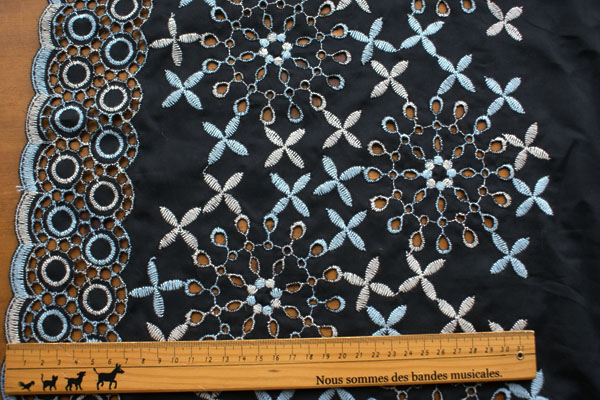 2色使いの大胆な柄のレースが目を引く、珍しく素敵なスカラップレースです。 生地は薄手で、上質な綿ローンです。 やや透け感がありますので、重ね着のワンピやチュニック、 ペチパンツ等のお洋服にピッタリです。 個性的なお洋服が出来そうです(*^^*)