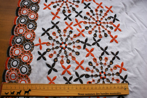 2色使いの大胆な柄のレースが目を引く、珍しく素敵なスカラップレースです。 生地は薄手で、上質な綿ローンです。 やや透け感がありますので、重ね着のワンピやチュニック、 ペチパンツ等のお洋服にピッタリです。 個性的なお洋服が出来そうです(*^^*)