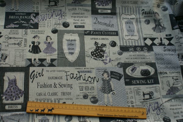 ミシンにアイロン、はさみ等のソーインググッズや クラッシックなお洋服に女の子がプリントされた レトロチックな雰囲気の懐かしさが漂う生地です。