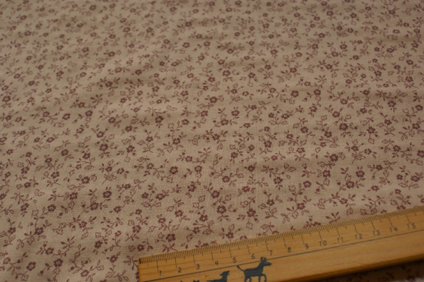 サーモンピンク系の地色にブラウンがかったパープルの小花がプリントされています。 柄が強調されすぎないので、とても使いやすいです。