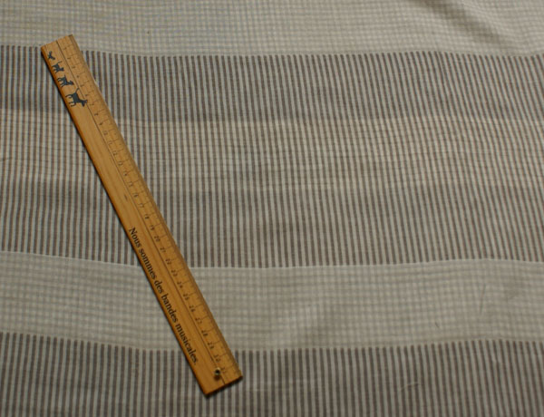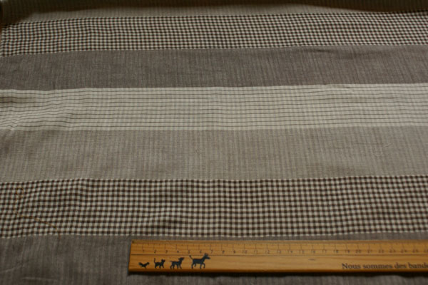 繊細な細い糸を使用しているので、まるでシルクの様な 心地よい肌触りの上品なダブルガーゼです。 片面はチェック、無地、ボーダーが6センチ幅ボーダーの リピートで織り込まれ、もう片面はストライプが18センチ、 無地が6センチのリピートになっています。 1枚で2通りの柄を楽しめるので、お得感もバッチリですね。