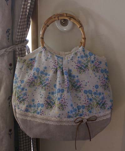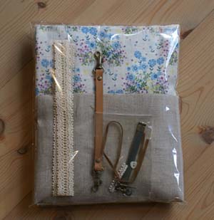 <キット内容> 表布、裏布、竹持ち手 接着キルト綿、リボン ボタン、ばね口、ナスカン付きハンドル レース、型紙、作り方説明書 |