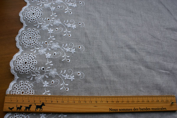 片みみがスカラップ加工されたリネンです。 厚みは中厚程度の厚さでで、透け感もなく、幅もたっぷりありますので、 無駄なく使って頂けます。 ワンピースやチュニックのお洋服作りにピッタリです。