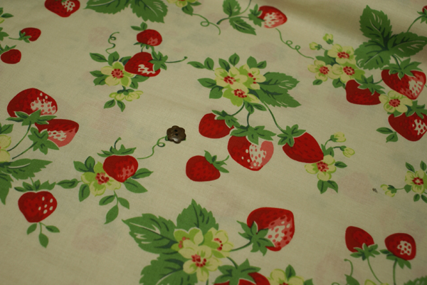 松山さんといえば、いちご柄ですね〜。 存在感のある、少し大きめのいちごが素敵ですよ♪ こちらの生地のベースは、薄っすら生成りがかっています。