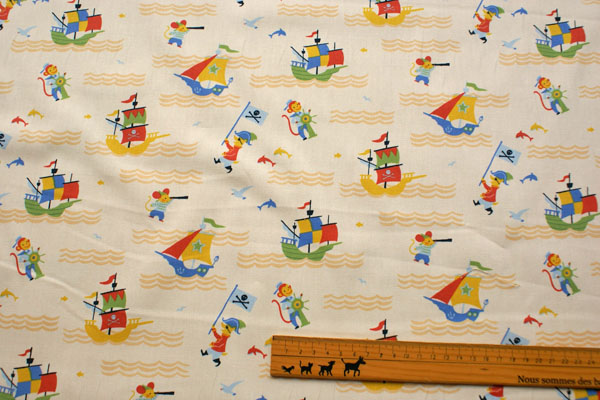 イラストレーター、コンノユキミさんデザインのPriate ship(海賊船)です。 ワクワクドキドキなプリントで見てるだけで楽しくなりますね♪ 生地はややしっかり目のオックス地なので バッグやポーチ、エプロン等にピッタリです。 入園入学グッズにも最適です。