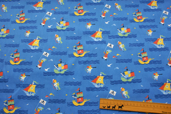 イラストレーター、コンノユキミさんデザインのPriate ship(海賊船)です。 ワクワクドキドキなプリントで見てるだけで楽しくなりますね♪ 生地はややしっかり目のオックス地なので バッグやポーチ、エプロン等にピッタリです。 入園入学グッズにも最適です。