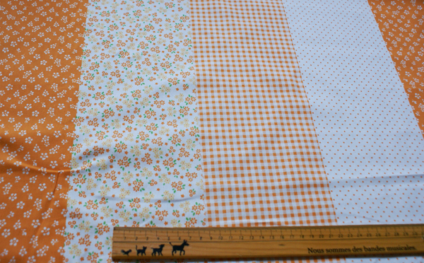 お花にドット、チェックがボーダーにプリントされた 一枚で4種類の柄が楽しめるキュートな生地です。 カーテンやクッション等のインテリア、バッグ等の 布小物等、いろいろ活躍してくれますよ♪